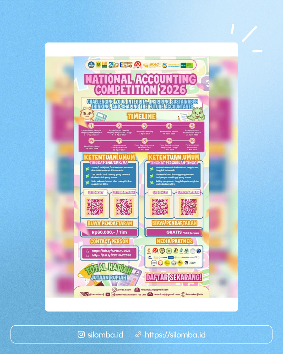 Ketua tim mengisi formulir pendaftaran dan membayar biaya pendaftaran.Setiap peserta wajib mengikuti akun instagram nac.expo.Setiap peserta wajib membagikan poster NAC 2026 di story instagram pribadi masing-masing.Setiap peserta wajib mengunggah Twibbon menggunakan akun pribadi dan tag akun Instagram nac.expo serta tag 5 akun teman masing-masing peserta.Apabila ketentuan di atas telah dilaksanakan, ketua tim mengirimkan berkas pendaftaran melalui link Google Form yang tertera pada https://linktr.ee/NationalAccountingCompetition.Ketua tim melakukan konfirmasi kepada Contact Person yang tertera.