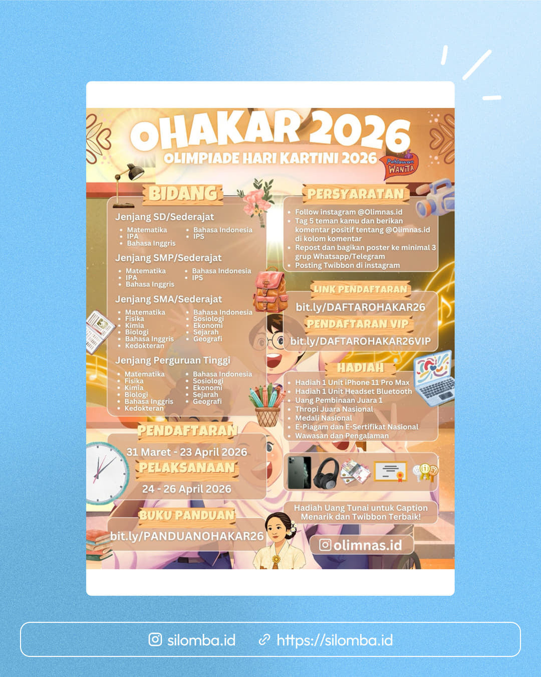 Follow instagram @Olimnas.idTag 5 teman kamu dan berikan komentar positif tentang @Olimnas.id di kolom komentarRepost dan bagikan poster ke minimal 3 grup Whatsapp/TelegramPosting Twibbon di instagram