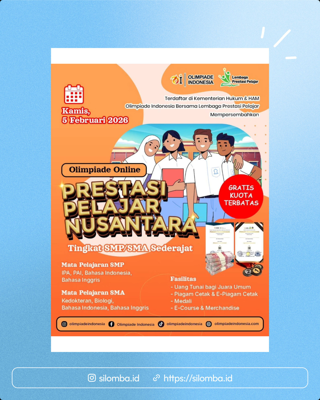 Sudah banyak sekali teman teman kalian yang lulus di universitas dan SMA yang menjadi favorit mereka 🤗 Daftar sekarang juga Link pendaftaran ada dibio instagram olimpiadeindonesia