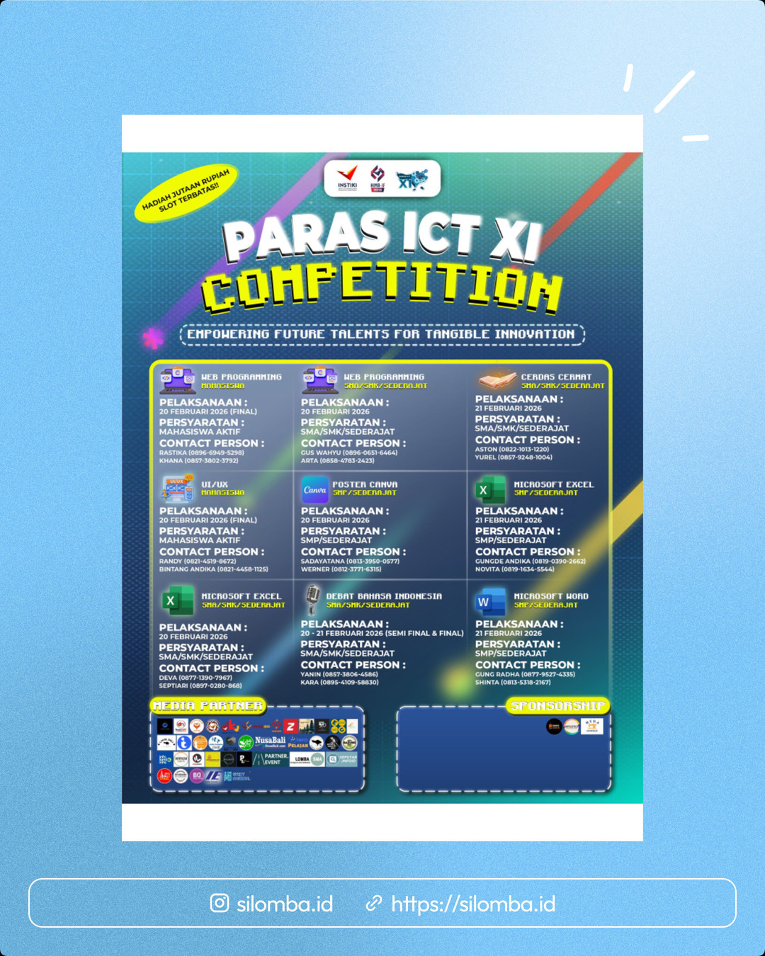 PARAS ICT XI mengajak generasi muda untuk menunjukkan karya dan kemampuan terbaik di bidang teknologi dan kreativitas. Pilih kategori sesuai jenjang pendidikan mu dan jadilah bagian dari generasi unggul yang siap berkompetisi!