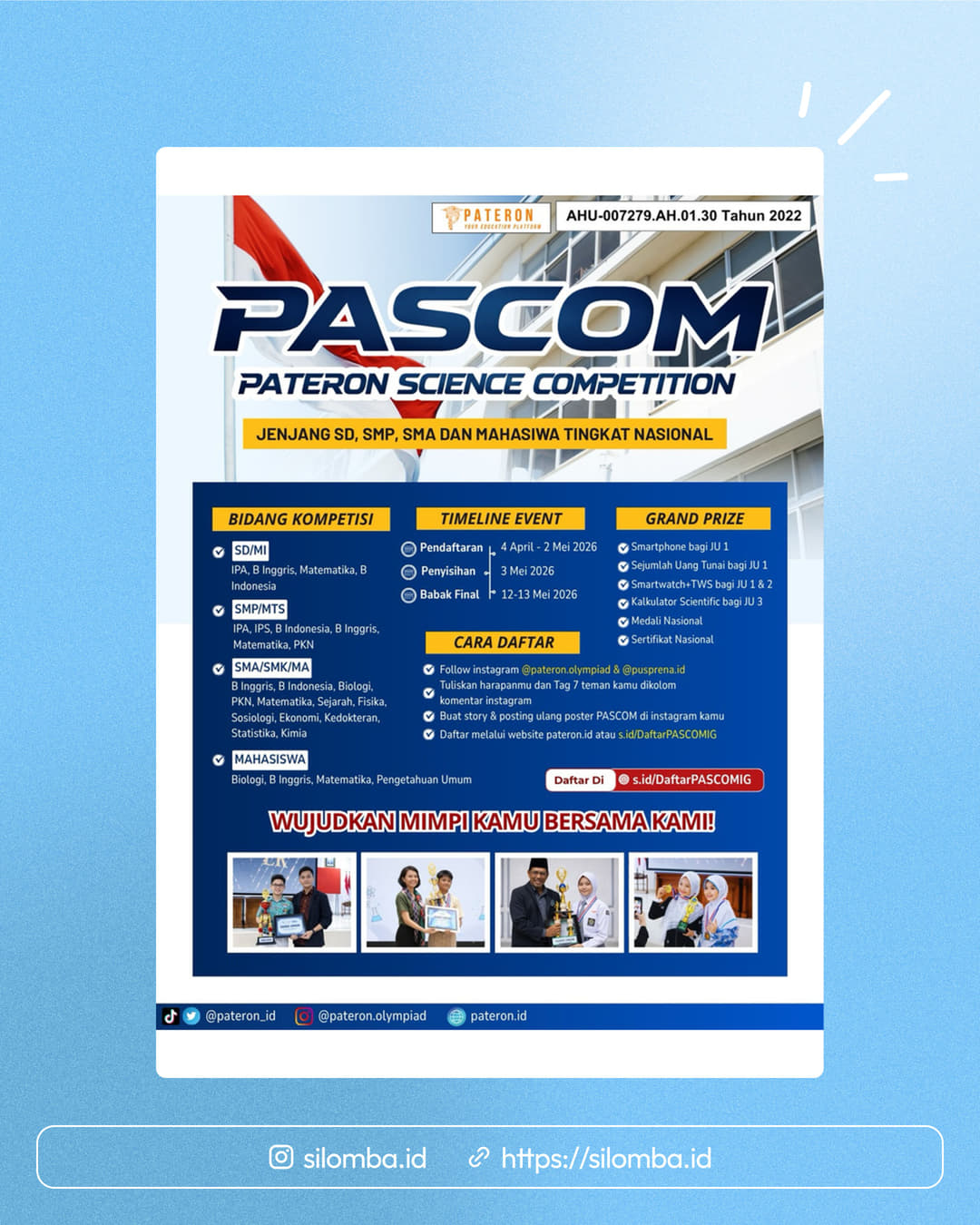 Follow Instagram pateron.olympiadTuliskan harapanmu untuk Pateron dan Tag 7 teman kamu dikolom komentarBuat story & posting ulang poster PASCOM di instagram kamuDaftar melalui website pateron.id atau s.id/DaftarPASCOMIG