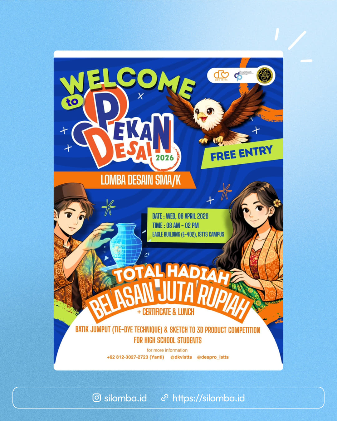 Workshop & Kompetisi: Level Up Skill Desainmu di Pekan Desain! šš° Pernah kepikiran buat belajar desain sambil langsung tanding memperebutkan hadiah jutaan rupiah? š¤ _This is your chance!_ 𤩠Di Pekan Desain, kita bakal seru-seruan bareng dalam sebuah sesi workshop yang dilombakan. Nggak perlu pusing mikirin alat, karena semua perlengkapan sudah disediakan langsung oleh panitia! Kamu tinggal bawa passion dan kreativitasmu aja. *Kenapa harus ikut?* ā Belajar & Berkarya: Kamu bakal dapet ilmu baru soal Batik Jumput (proses pembuatan motif dengan teknik ikat celup/ tie-dye) & 3D Product Design. ā Fasilitas Lengkap: Nggak perlu bawa alat, all set dari ISTTS! ā Total Hadiah: BELASAN JUTA RUPIAH untuk para juara! šø ā Benefit Tambahan: Sertifikat dan Lunch gratis! *Detail Acara:* š Rabu, 08 April 2026 š ISTTS Campus š FREE ENTRY (Slot Terbatas!) _Seats are filled up fast!_ Jangan sampai kesempatan emas buat nambah skill sekaligus bawa pulang hadiah besar ini lepas begitu saja. š *_Amankan kursimu sekarang dengan scan QR Code di poster atau click link ini!_* https://forms.gle/xaUktSMy4TixaBwaA š© Butuh info lebih detail? Langsung DM ke Instagram dkvistts atau WA ke 0812-3027-2723 (Yanti) _Siap buat menang? See you there! ⨠#istts #lombadesain #desproistts #dkvistts #haloistts Silomba hanya media informasi lomba. Untuk info lebih lanjut, silakan hubungi penyelenggara.