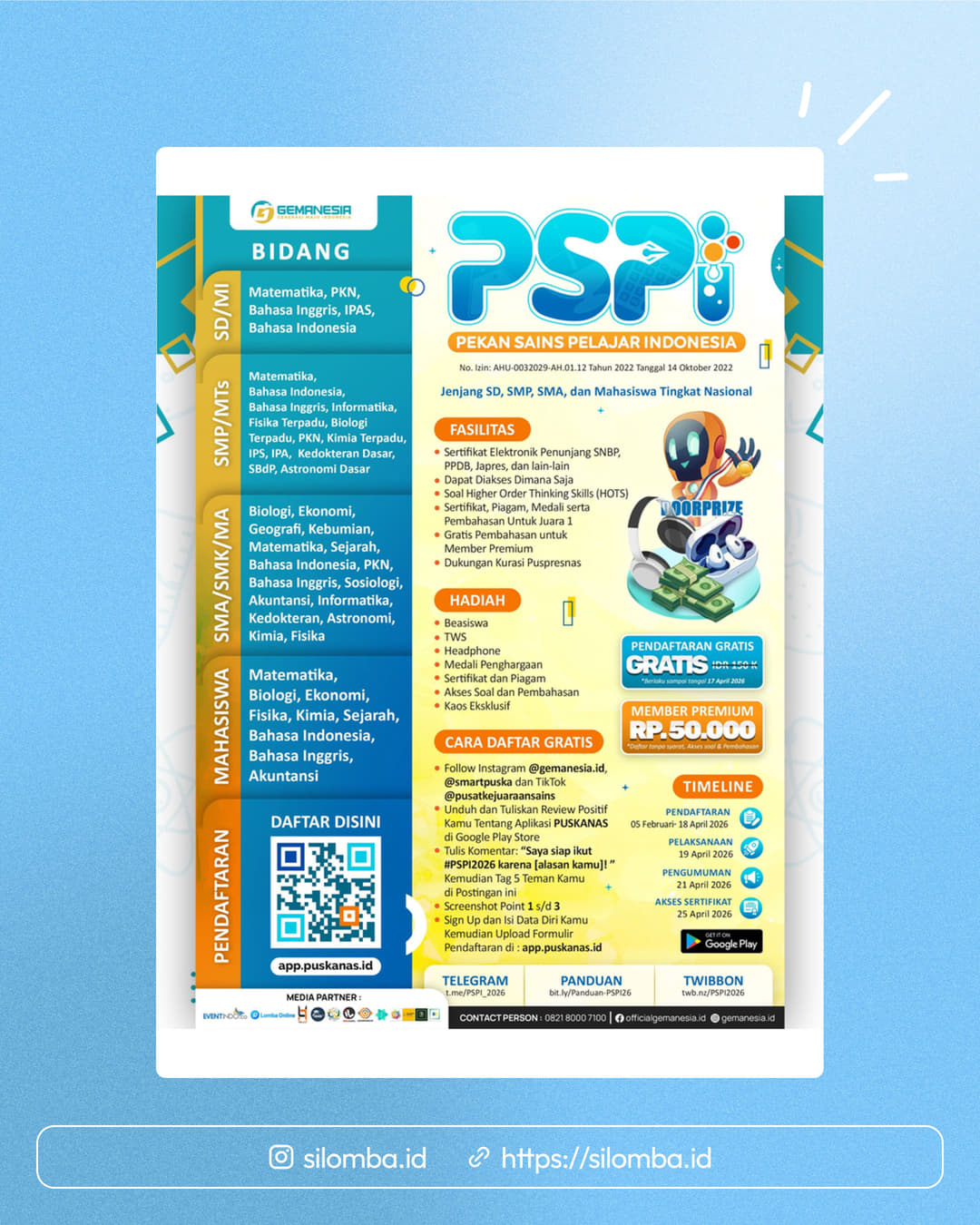 Follow Instagram @gemanesia.id & @smartpuska on TikTok @pusatkejuraansainsUnduh dan Tuliskan Review Positif Kamu Tentang Aplikasi PUSKANAS di Google Play StoreTulis Komentar: "Saya siap ikut #PSPI2026 karena [alasan kamu]!" di Postingan Tag 5 Teman Kamu di KemudianScreenshot Point 1,2,3Upload di Instagram Story Kamu dan Upload Formulir Pendaftaran