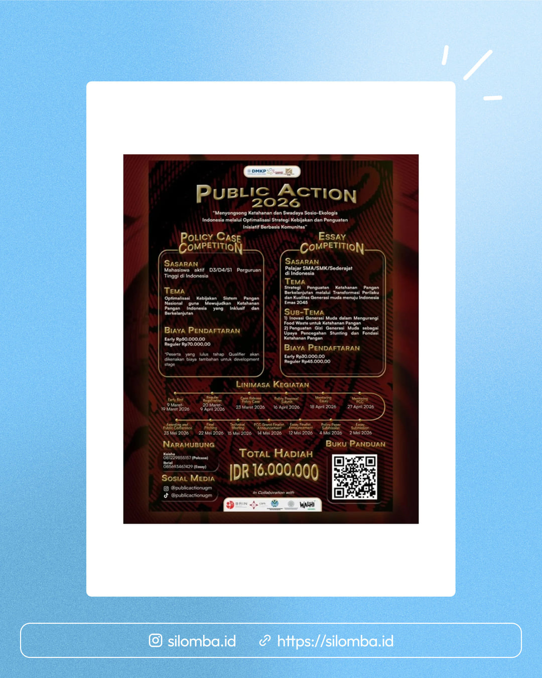HELLO, FUTURE POLICYMAKERS! πβ¨ Tertarik dengan isu kebijakan publik? π€© Public Action UGM is Calling ππ Yuk daftarkan dirimu di Perlombaan Public Action 2026 yang diselenggarakan oleh mahasiswa Manajemen dan Kebijakan Publik UGM! Lomba ini cocok banget buat kamu yang kritis, kreatif, dan ingin berkontribusi nyata! π‘ Cabang Lomba: 1. Policy Case Competition 2. β Essay Competition π Benefit: 1. Uang Tunai dan Sertifikat 3. β Mentoring Session 4. β Free Access to Public Conference 5. Networking Oppurtunities Guidebook & link pendaftaran kompetisi dapat dilihat melalui link berikut: https://bit.ly/BukuPanduanPA26 π² Info lengkap & pendaftaran dapat menghubungi kontak kami: π€ Keisha Farella - Policy Case (βͺ+62Β 812β2985β5157β¬) π€ Ibriel Keane - Essay (+62 856-9346-7429) Yuk, jangan lewatkan kesempatan ini! Saatnya suarakan ide dan wujudkan perubahan bersama Public Action UGM 2026! π₯ #PublicAction2026 #UniversitasGadjahMada #InfoLomba #Essay #PolicyCase Silomba hanya media informasi lomba. Untuk info lebih lanjut, silakan hubungi penyelenggara.