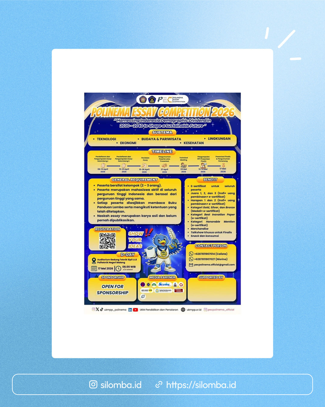 Peserta terdiri dari kelompok (2-3 orang).Peserta merupakan mahasiswa aktif di seluruh perguruan tinggi Indonesia dan berasal dari perguruan tinggi yang sama.Setiap peserta diwajibkan membaca Buku Panduan Lomba serta mengikuti ketentuan yang telah ditetapkan.Naskah esai merupakan karya asli dan belum pernah dipublikasikan.