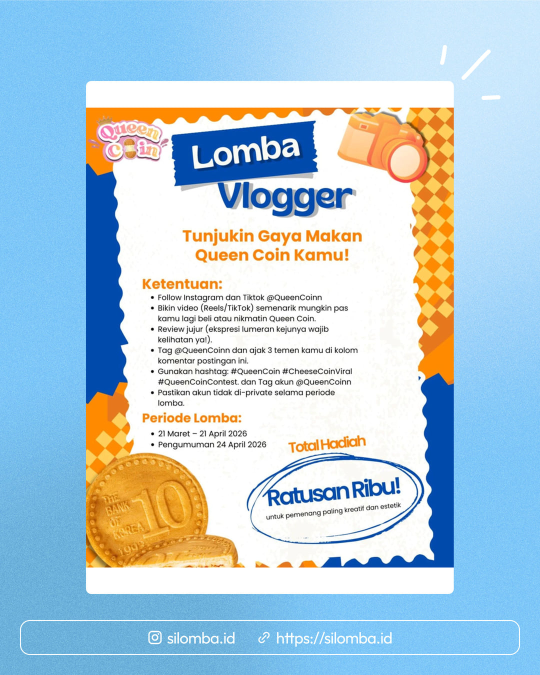 Ayo tunjukin kreativitas kamu di Queen Coin Vlog Competition! Caranya gampang banget, tinggal beli Queen Coin favorit kamu di outlet kita yang ada di samping Masjid Raya Puri Teluk JambeKlik untuk membuka panel samping guna melihat informasi selengkapnya, rekam momen serunya, dan posting!