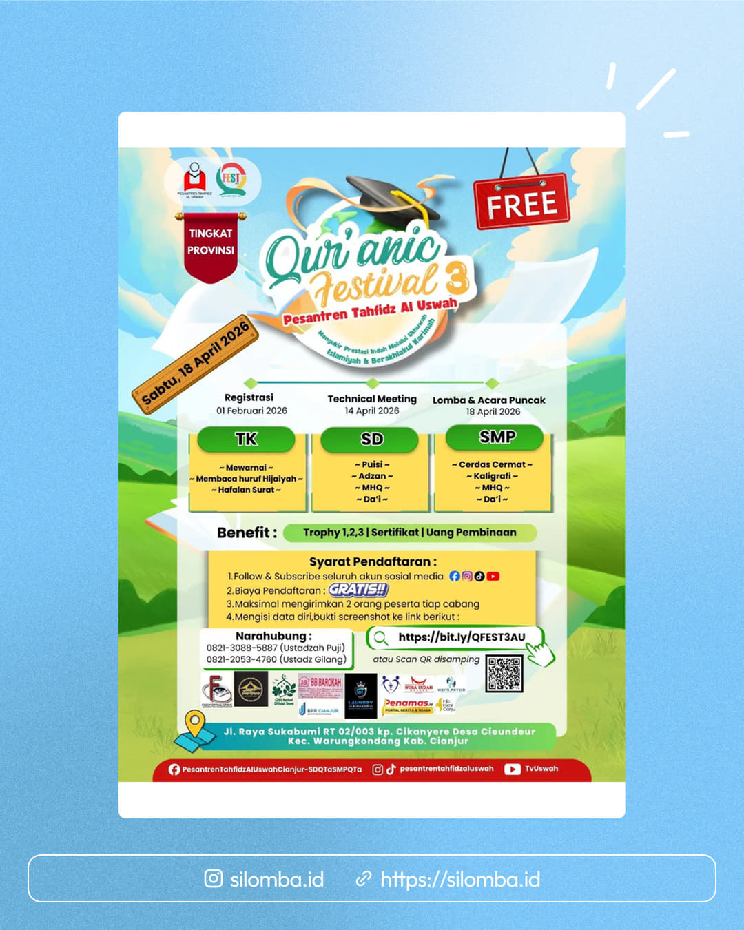 Follow & Subscribe seluruh akun sosial mediaMaksimal mengirimkan 2 orang peserta tiap cabangMengisi data diri, bukti screenshot ke link berikut