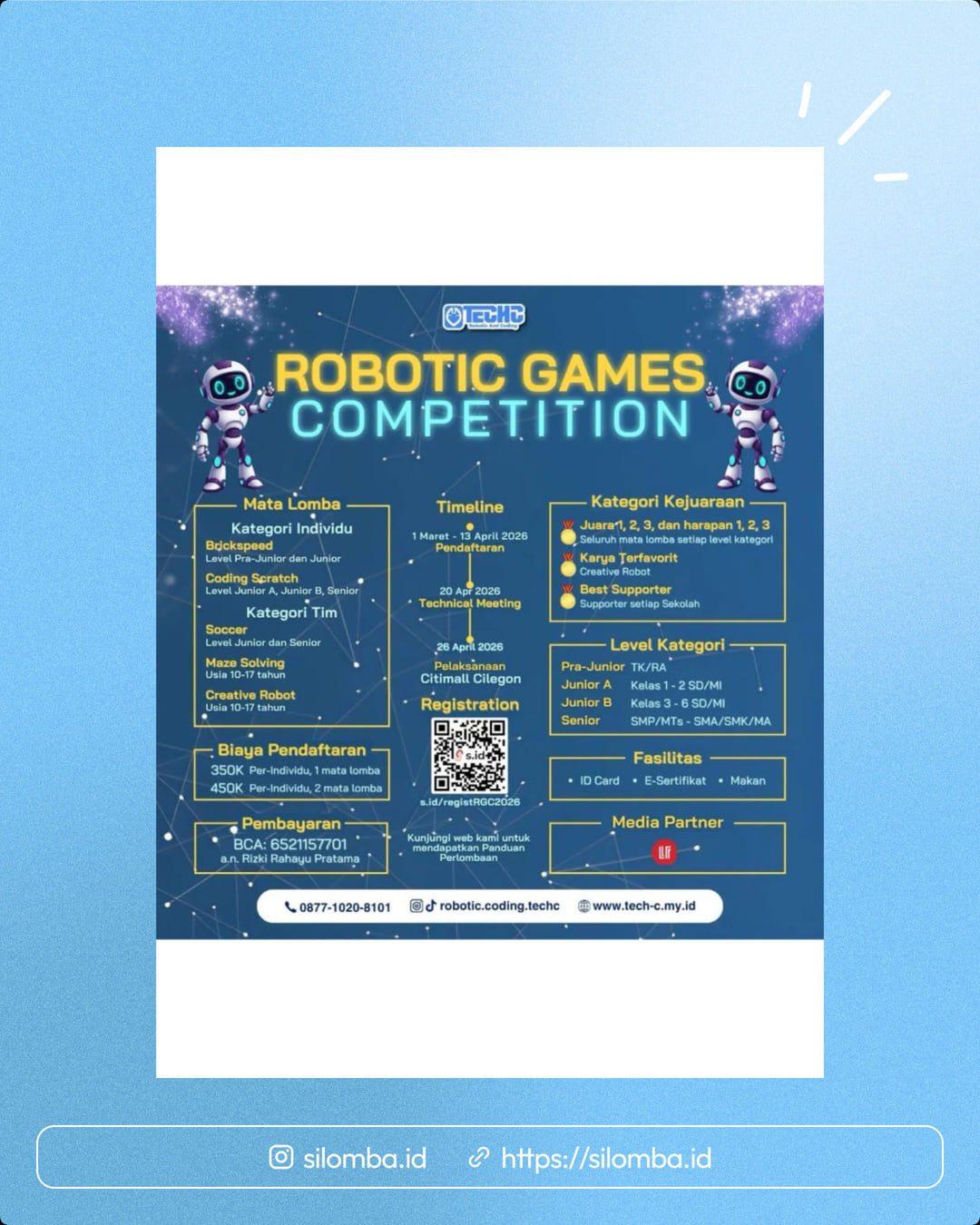 š£ Kabar seru buat calon juara robotik masa depan! TECHNO TRAINING CENTER proudly presents š¤š ROBOTIC GAMES COMPETITION 2026 šš¤ Ajang adu kreativitas, logika, dan skill robotik untuk peserta TK/RA sampai SMP/MTs. Yuk siapkan tim terbaikmu dan tunjukkan inovasimu di arena kompetisi robotik tahun ini! OTECHC ROBOTIC GAMES COMPETITION Mata Lomba Timeline Kategori Kejuaraan Kategori Individu Juara1,2,3,dan harapan1,2,3 1Maret-13April2026 Seluruh mata lomba setiap level kategori Brickspeed Pendaftaran Level Pra-Junior dan Junior Karya Terfavorit Coding Scratch Creative Robot Level Junior A,Junior B,Senior 20Apr 2026 Best Supporter Technical Meeting Supporter setiap Sekolah Kategori Tim Soccer Level Junior dan Senior 26April 2026 Level Kategori Maze Solving Pelaksanaan Pra-Junior TK/RA Usia 10-17 tahun Citimall Cilegon Junior A Kelas1-2SD/MI Registration JuniorB Kelas3-6SD/MI Senior SMP/MTs-SMA/SMK/MA Biaya Pendaftaran Fasilitas 350K Per-Individu,1mata lomba ID Card E-Sertifikat 450K Per-Individu,2 mata lomba Makan s.id/registRGC2026 Pembayaran Media Partner BCA:6521157701 Kunjungi web kami untuk mendapatkan Panduan a.n.Rizki Rahayu Pratama Perlombaan 0877-1020-8101 robotic.coding.techc