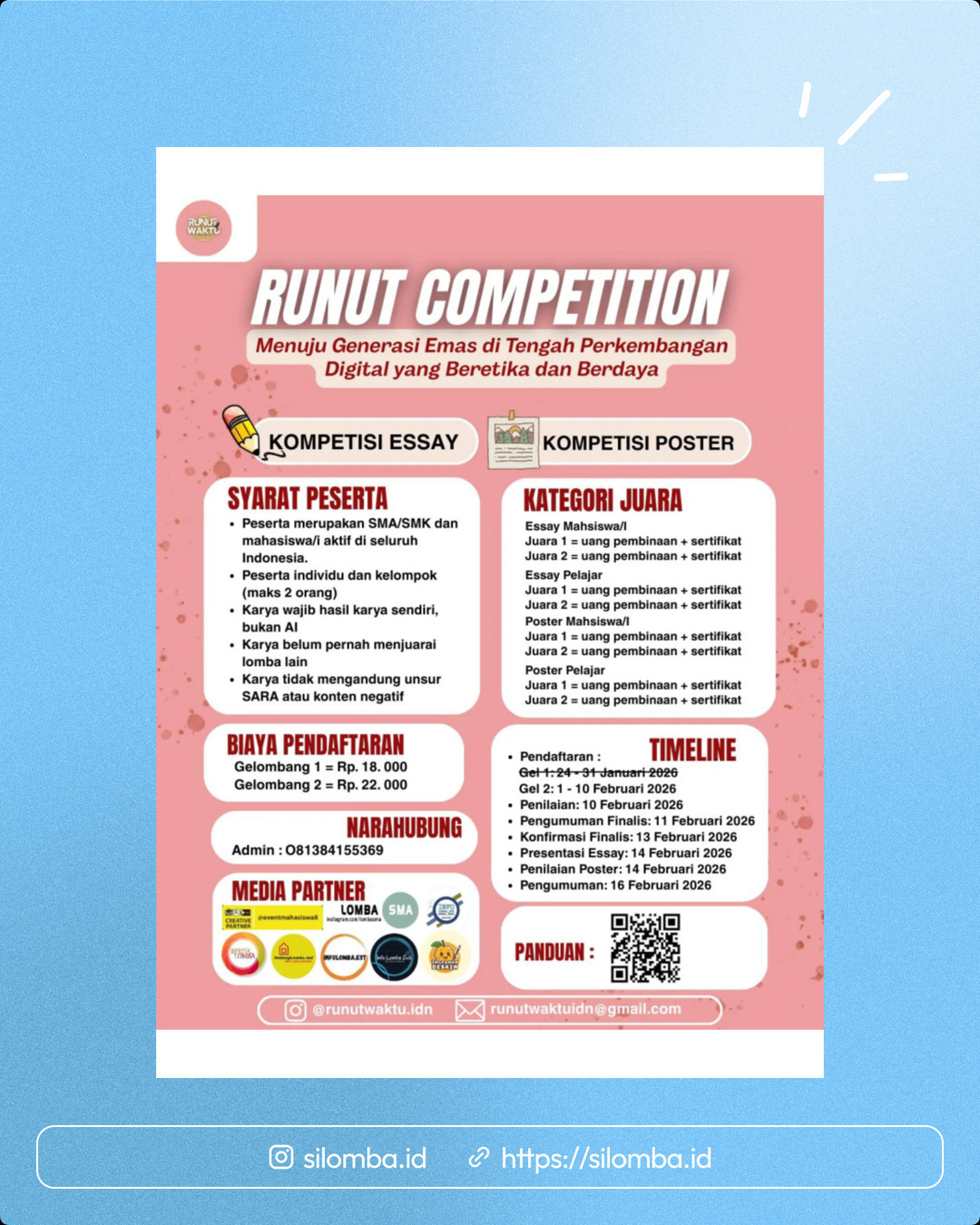 š Panduan & Pendaftaran: [Scan QR Code pada Flyer] š± Instagram: runutwaktu.idn š Narahubung (Admin): 081384155369