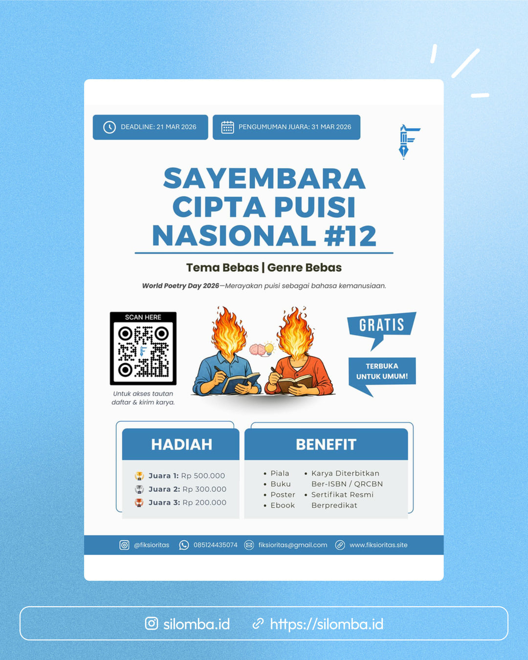 SAYEMBARA CIPTA PUISI NASIONAL ke-12 β¨ Pendaftaran GRATIS! π Tema & Genre: Bebas π Terbuka untuk Umum! π Berhadiah uang tunai + piala, sertifikat berpredikat, buku, poster, dan lainnya! ποΈ Kini sudah waktunya: World Poetry Day 2026βMerayakan puisi sebagai bahasa kemanusiaan. π© Akses tautan pendaftaran & pengiriman karya di: π www.fiksioritas.site π² Jangan lupa follow fiksioritas untuk info lengkap & update terbaru! #lombapuisi #lombamenulispuisi #puisi #lomba #lombamenulis