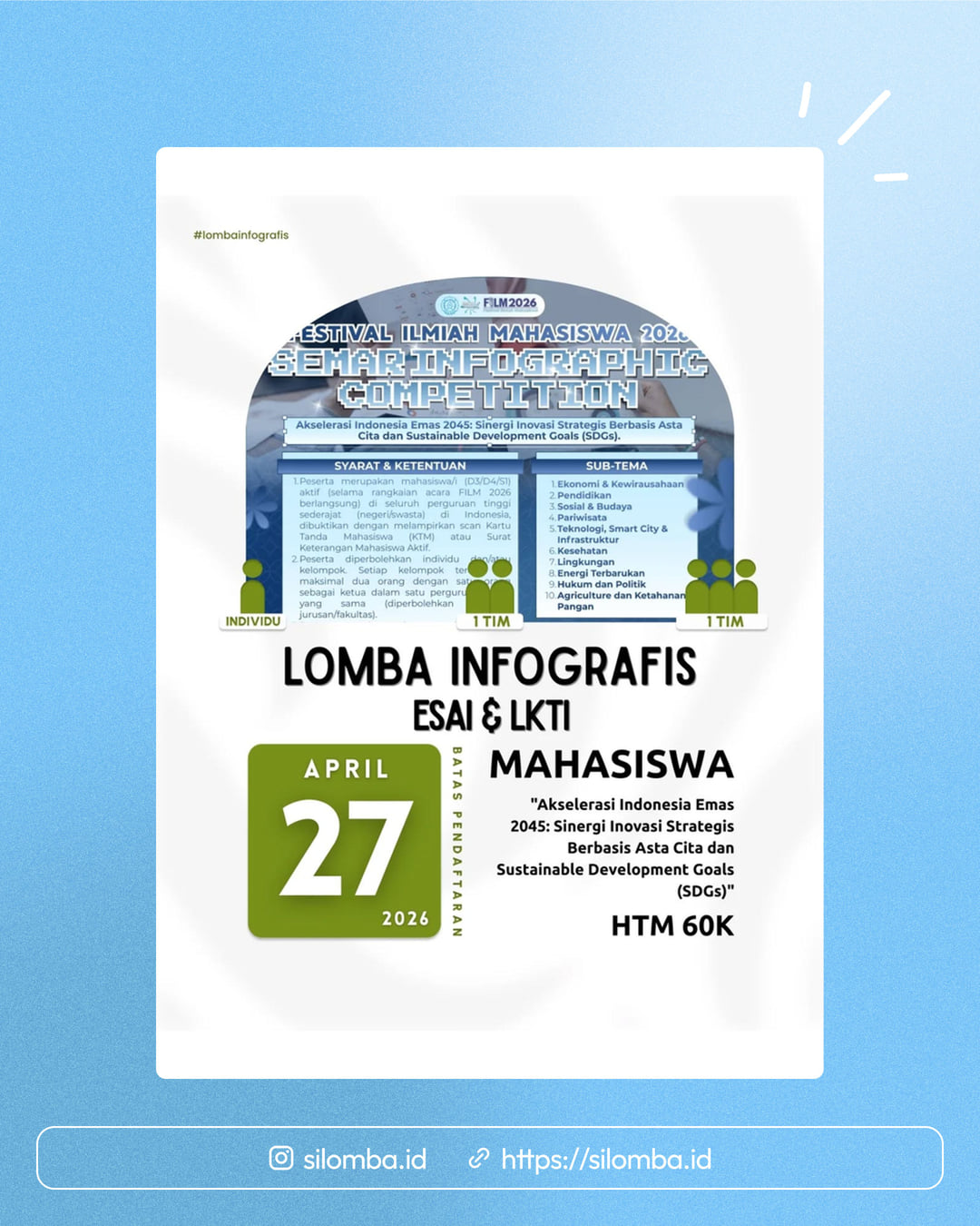 Ikuti Lomba Esai, Inforgafis, dan Karya Tulis Ilmiah Mahasiswa Tingkat Nasional 2026 dan jadilah bagian dari generasi muda yang inovatif dan kreatif!