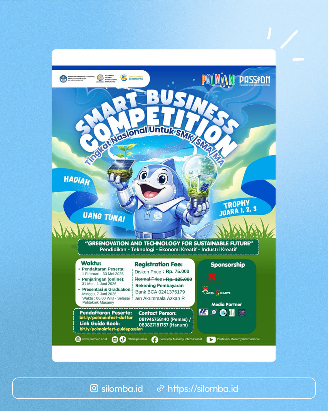 πŸ’‘πŸŒ± SMART BUSINESS COMPETITION 2026 πŸŒ±πŸ’‘ Punya ide bisnis kreatif dan berdampak? Saatnya kamu tunjukkan di ajang Kompetisi Bisnis Tingkat Nasional untuk SMA/SMK/MA! πŸš€ ✨ Tema: Greenovation and Technology for Sustainable Future (Pendidikan – Teknologi – Ekonomi Kreatif – Industri Kreatif) πŸ† Hadiah: πŸ’° Uang Tunai πŸ₯‡ Trophy Juara 1, 2, & 3 πŸ’Έ Registration Fee: Rp125.000 ➝ Rp75.000 πŸ“… Timeline: Pendaftaran: 1 Februari – 30 Mei 2026 Penjaringan (Online): 31 Mei – 1 Juni 2026 Presentasi & Graduation: 7 Juni 2026 πŸ“ Pelaksanaan: Online & Presentasi Akhir di Politeknik Masamy πŸ”— Daftar sekarang: bit.ly/polmainfest-daftar πŸ“˜ Guidebook: bit.ly/polmainfest-guidepassion polmainfest πŸ“ž Contact Person: Pemas: 081946758140 Hanum: 083827181757 πŸ”₯ Jangan cuma jadi penontonβ€”jadi inovator masa depan! Wujudkan ide bisnismu jadi nyata dan berdampak untuk dunia 🌍 #Passion2026 #BusinessCompetition #LombaBisnis #PelajarIndonesia #WirausahaMuda CreativeIndustry GreenInnovation FutureEntrepreneur Silomba hanya media informasi lomba. Untuk info lebih lanjut, silakan hubungi penyelenggara.