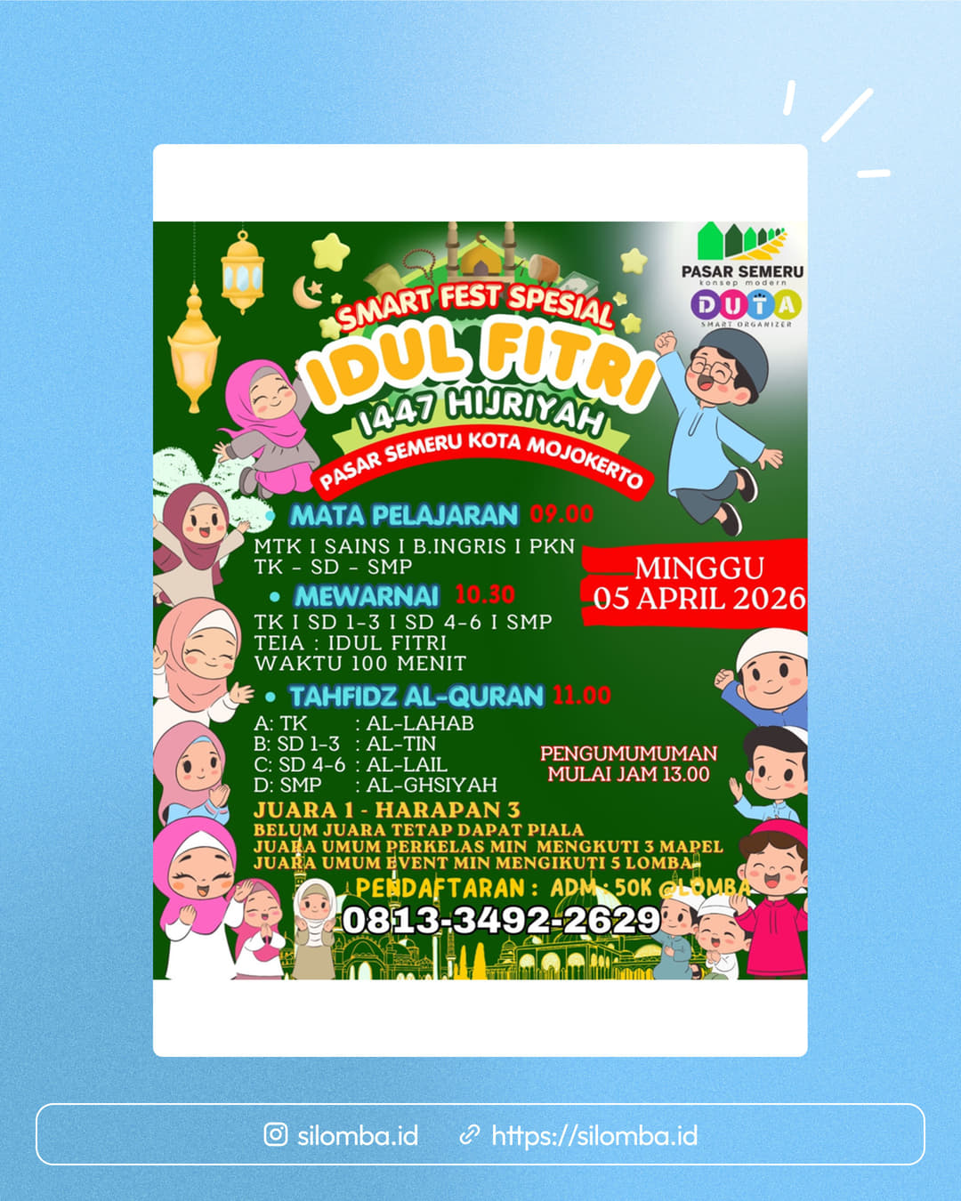 Yuk, asah bakat dan prestasi di SMART FEST SPESIAL IDUL FITRI 1447 H! Bakal ada berbagai lomba seru mulai dari Mata Pelajaran, Mewarnai, sampai Tahfidz Al-Quran. Pas banget buat ngisi waktu liburan dengan kegiatan positif!