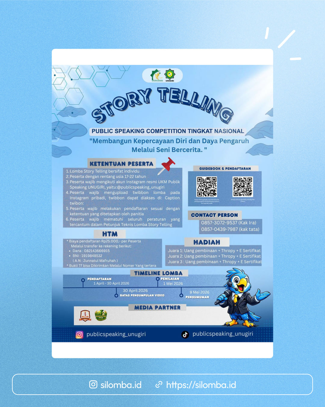Peserta wajib mengikuti akun Instagram resmi UKM Public Speaking UNUGIRIPeserta wajib mengupload twibbon lomba pada instagram pribadi