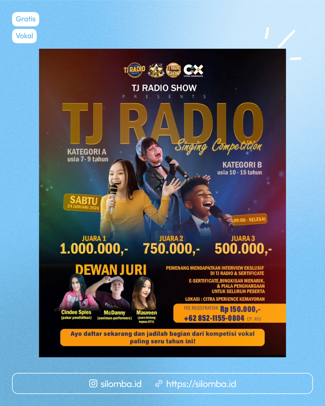 ✨ Pemenang akan mendapatkan interview eksklusif di TJ Radio, sertifikat, e-sertifikat, bingkisan menarik, dan piala penghargaan untuk seluruh peserta!
