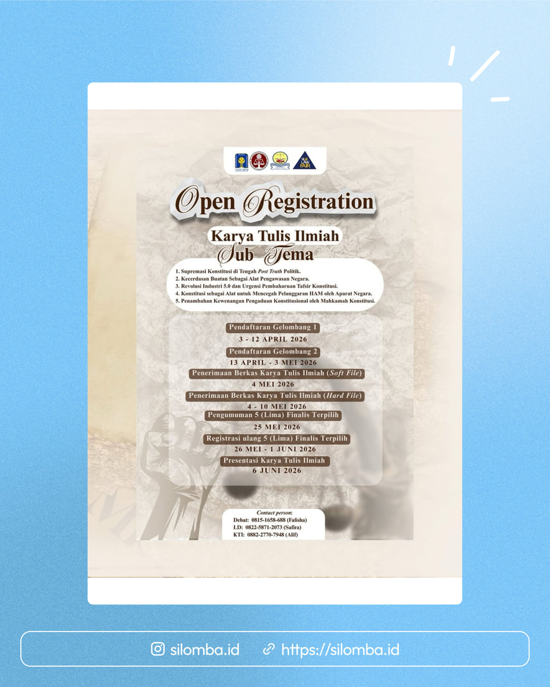 OPEN REGISTRATION UII LAW FAIR 2026] 🏆 Piala Moh. Natsir ke-7 Halo para delegasi kampus se-Indonesia! Saat yang kalian tunggu akhirnya tiba UIILaw Fair 2026 resmi dibuka! Tunjukkan kemampuan terbaikmu dan jadilah bagian dari ajang prestisius ini! 📌 Pilihan Lomba: ⚖️ Lomba Debat Hukum Nasional 🔗 https://bit.ly/FormPendafatranDebatPMN2026 📚 Karya Tulis Ilmiah (KTI) 🔗 https://bit.ly/FormPendaftaranKTIPMN2026 📝 Legislative Drafting 🔗 https://bit.ly/FormPendaftaranLegislativeDraftingPMN2026 📞 Contact Person: 📍 Debat Hukum: 0815-1658-688 (Falisha) 📍 KTI: 0882-2770-7948 (Alif) 📍 Legislative Drafting: 0822-5871-2073 (Safira) ✨ Jangan lewatkan kesempatan ini untuk berprestasi dan berkompetisi dengan delegasi terbaik dari seluruh Indonesia! Siapkan dirimu kami tunggu kehadiran sang juara! #UIILawFair2026 #PialaMohammadNatsir #LawFair #LombaNasional #MahasiswaBerprestasi ComingSoon